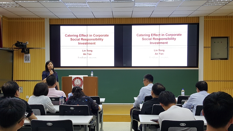 报告会上,颜安教授结合自己多年来在公司金融、行为金融等领域的研究成果,做了“公司社会责任的迎合效应”为题的主题演讲。颜教授首先阐述了研究公司社会责任的社会价值和学术动机,并对其中的概念进行了简单介绍。其中,颜教授着重介绍了企业社会责任对于国外投资者的重要性以及背后的深层次原因。而后,颜教授按照所得结论,对相关文献进行了梳理,让在场师生对这个主题产生更深层次的了解。之后进入研究设计环节,颜教授先后对数据来源、模型设计和实证结果进行了详细的介绍,并穿插阐释了外国科学研究的范式,开阔了参会师生的科研国际视野。