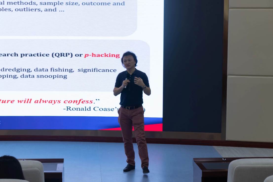 会上,常鑫教授充分论证了当前科研生态下,实验研究与实证研究结果中存在P值不连续,即P值操纵的可能性,并具体探讨了造成这一问题的驱动因素以及如何运用计量方法分析P值操纵的影响因素。常鑫教授不仅为色情网 师生展示了规范的科研论文的写作框架和研究范式,同时也提升了师生们的学术规范理念,加强了色情网 科研诚信和学术道德建设。