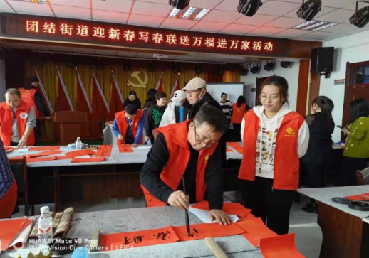 令我印象最深的还是1月7日,临近春节,我所在的团结街道开展“迎新春写春联送万福进万家”活动。这也是我收到的第一次工作任务,那时我的心情格外激动兴奋。我们将写好的春联和全家福照片送到百姓家中,第一家是五口之家,奶奶和照片里一样笑得十分和蔼;第二家是一位退役老军人的家,老爷爷接受采访时说了好多遍“感谢党,感谢政府的关怀”,站在一旁的我听了倍受鼓舞;第三家是两位中年夫妇,大叔说这次照相是两人第一次在相片中拉着手;最后一家是有一位身患白血病的孩子,返回社区的路上同行的阿姨跟我们讲这个孩子曾休学一年治病还考上了洮南一中,学习成绩很不错。每一个人身上都有让我为之心动的瞬间,欣慰、感动、震撼......种种情感皆在这一次小小的活动中体现,在我们的城市中,也遍布温情,不缺力量。在社区举办的写对联活动里,我还见到了我的小学美术老师,我才猛地意识到,我长高了,老师也渐渐老去。但老师的风韵却不减当年,一挥毛笔仍能写下洋洋洒洒的豪迈大字。