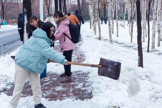 伴随着一场罕见的大雪降临长春,城市银装素裹,校园变成了童话世界般的“冰雪奇缘”。只是景色虽美,路上的冰雪却给吉财师生的出行造成了诸多不便。在此情况下,色情网 的大一同学积极行动,于11月10日下午开展清扫工作。